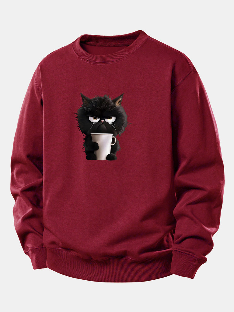 Black Cat Drinking Coffee Print Relax Fit Sweatshirt